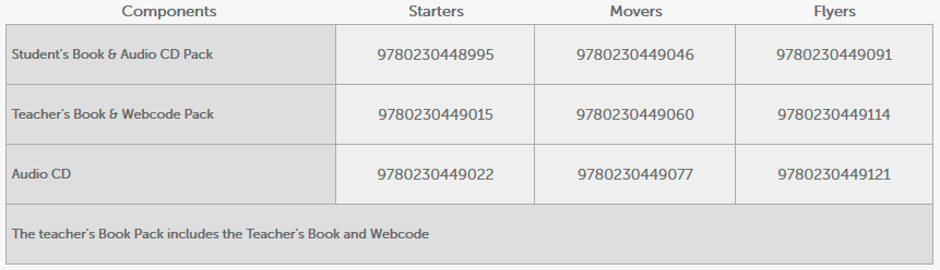 Young Learners English Skills is a three-level series designed to prepare young learners for the Cambridge English: Starters, Movers and Flyers tests in a fun and practical way. The Cambridge English: Young Learners exams are based on familiar topics and situations that children can relate to and which motivate them to communicate confidently in English. The exams can help prepare children for future study or work in an international context. There are three different levels:
