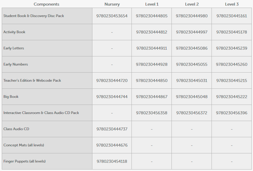 - The new nursery level encourages children to engage with English, learning and print awareness through teacher-led, structured play. A key feature of this is the Learning Kits, which enable the teacher to model an interaction and the children to explore this further in their own way.